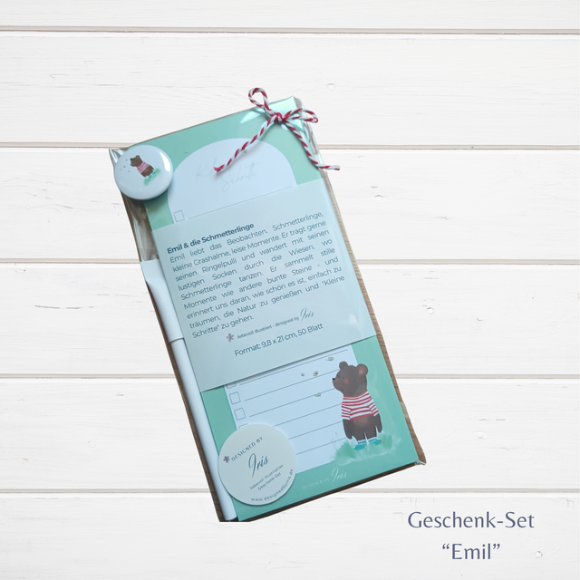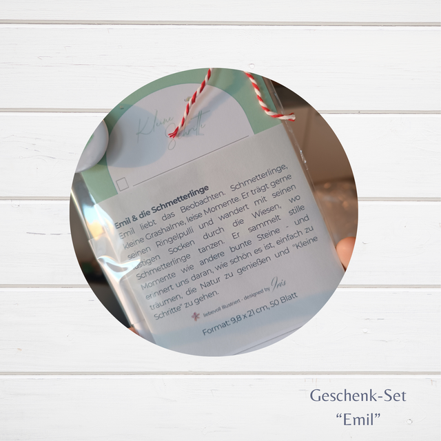 Emil liebt das Beobachten. Schmetterlinge, kleine Grashalme, leise Momente. Er trägt gerne seinen Ringelpulli und wandert mit seinen lustigen Socken durch die Wiesen, wo Schmetterlinge tanzen. Er sammelt stille Momente wie andere bunte Steine - und erinnert uns daran, wie schön es ist, einfach zu träumen, die Natur zu genießen und "Kleine Schritte" zu gehen.
