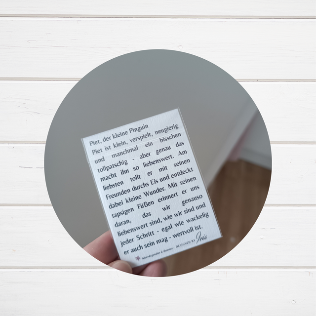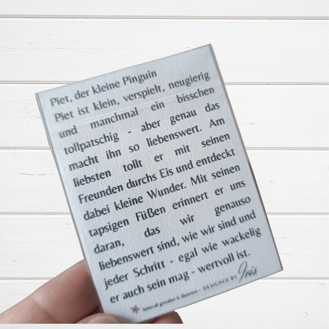 Piet ist klein, verspielt, neugierig und manchmal ein bisschen tollpatschig - aber genau das macht ihn so liebenswert. Am liebsten tollt er mit seinen Freunden durchs Eis und entdeckt dabei kleine Wunder. Mit seinen tapsigen Füßen erinnert er uns daran, das wir genauso liebenswert sind, wie wir sind und jeder Schritt - egal wie wackelig er auch sein mag - wertvoll ist.